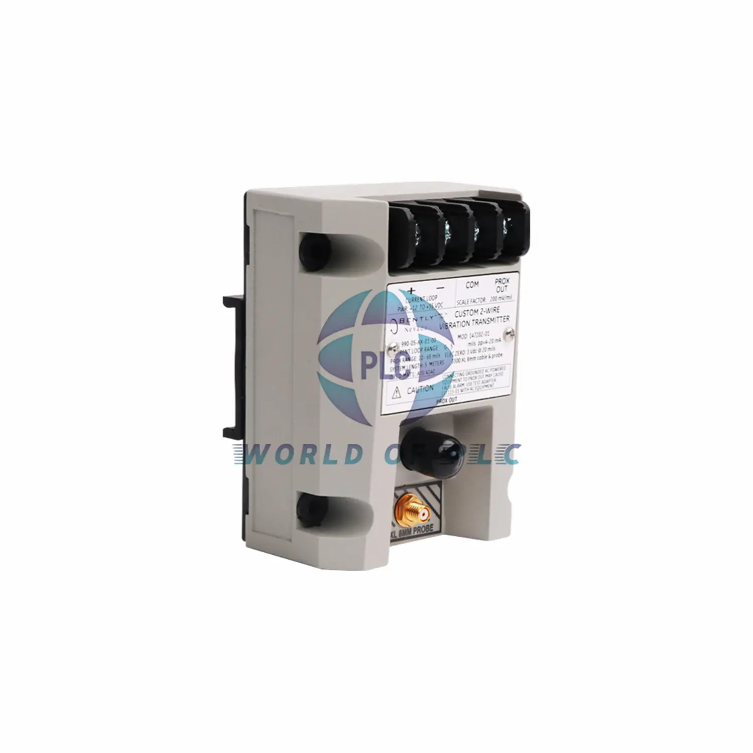 Snaps onto DIN rails. Use with 3300 NSv probe. Keep wires short.